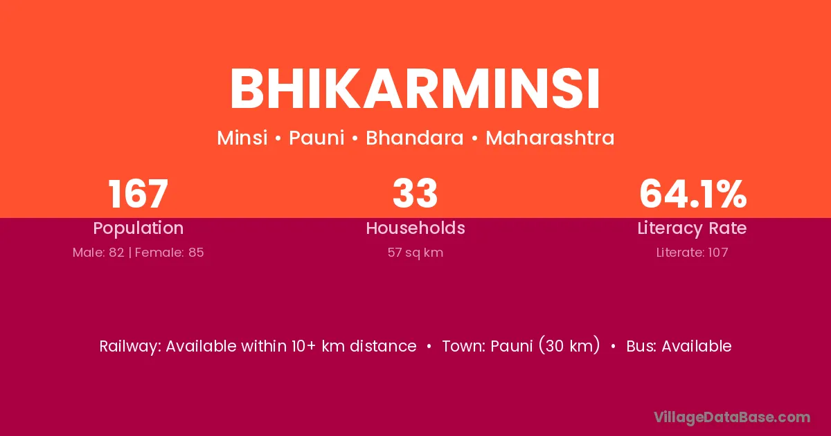 Pauni (30 km) is the nearest town to Bhikarminsi village for major economic activities and is located approximately 30 km away.