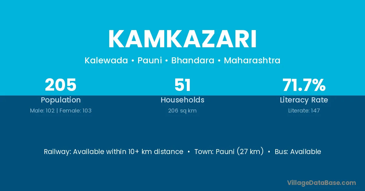 Pauni (27 km) is the nearest town to Kamkazari village for major economic activities and is located approximately 27 km away.