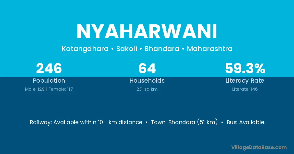 Bhandara (51 km) is the nearest town to Nyaharwani village for major economic activities and is located approximately 51 km away.