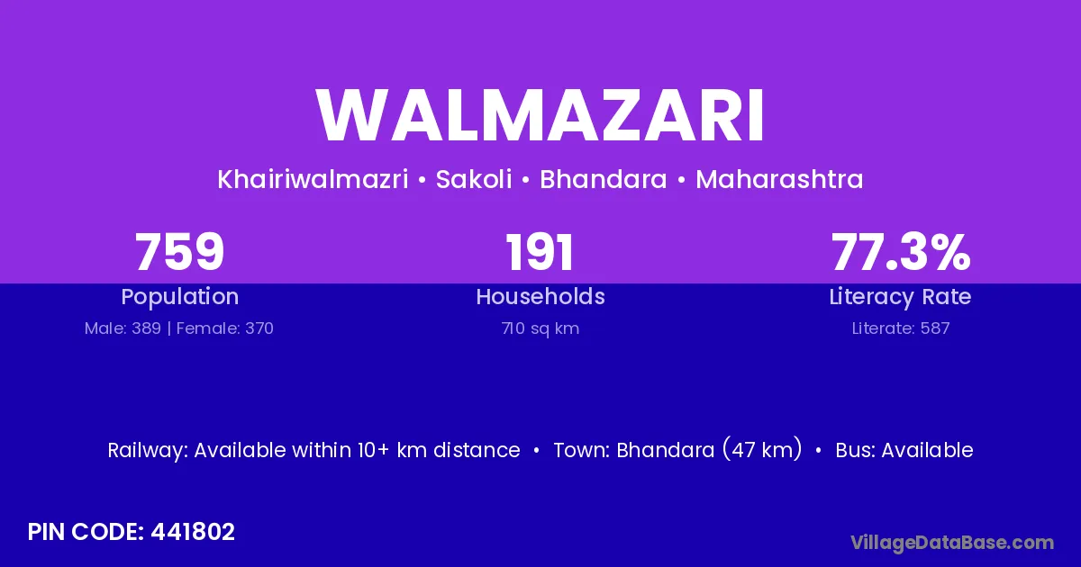Bhandara (47 km) is the nearest town to Walmazari village for major economic activities and is located approximately 47 km away.