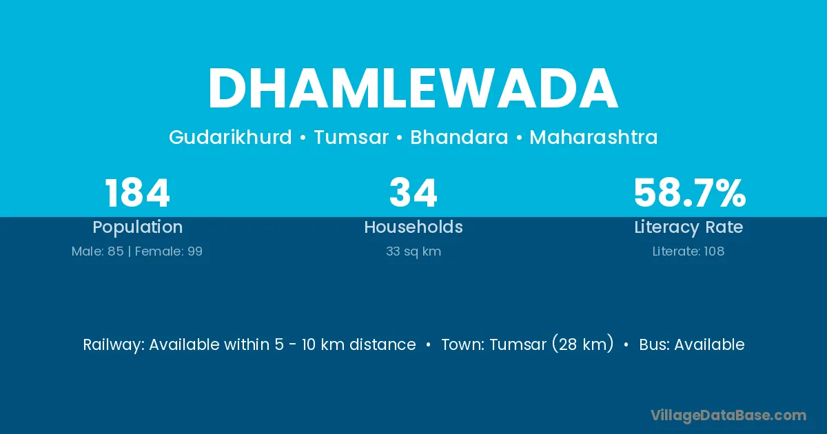 Tumsar (28 km) is the nearest town to Dhamlewada village for major economic activities and is located approximately 28 km away.