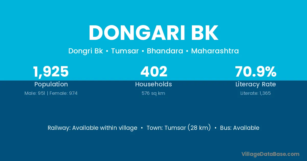 Tumsar (28 km) is the nearest town to Dongari Bk village for major economic activities and is located approximately 28 km away.