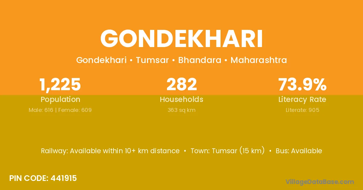 Tumsar (15 km) is the nearest town to Gondekhari village for major economic activities and is located approximately 15 km away.
