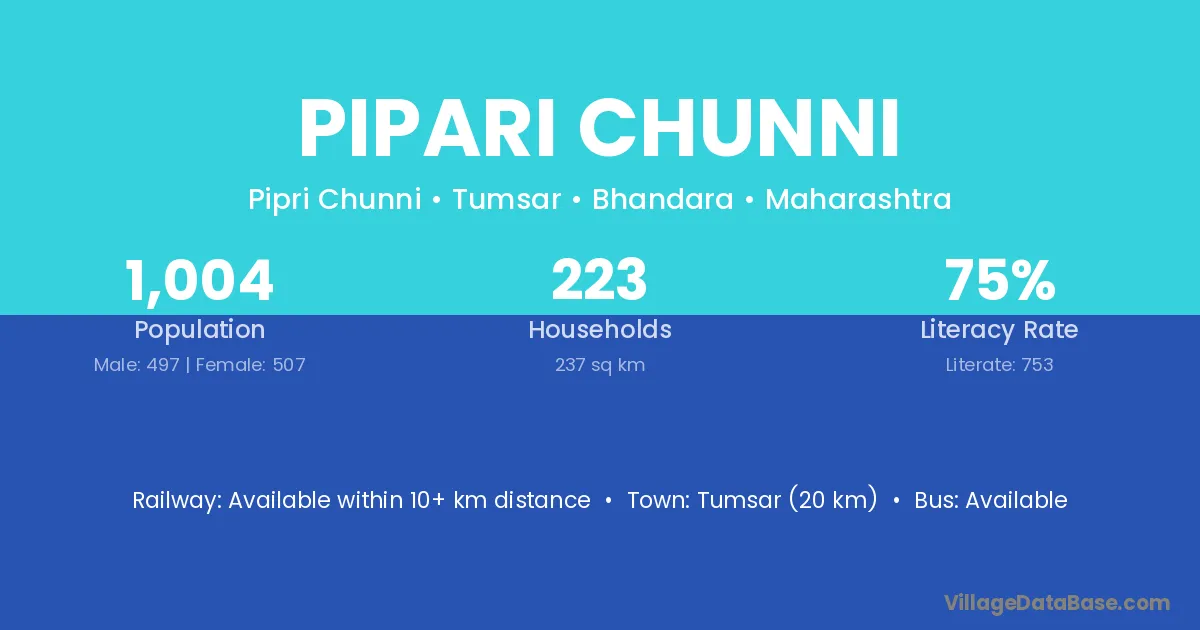 Tumsar (20 km) is the nearest town to Pipari Chunni village for major economic activities and is located approximately 20 km away.