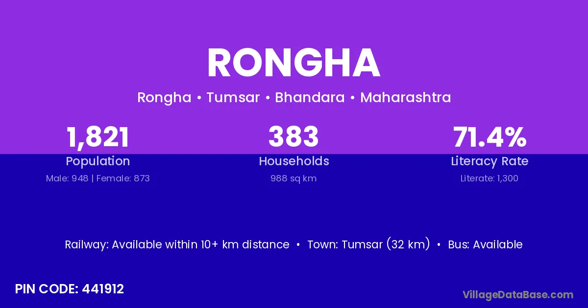 Tumsar (32 km) is the nearest town to Rongha village for major economic activities and is located approximately 32 km away.