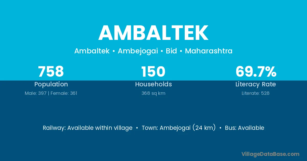 Ambejogai (24 km) is the nearest town to Ambaltek village for major economic activities and is located approximately 24 km away.