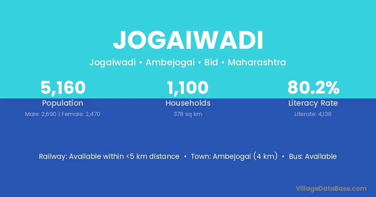 Jogaiwadi village has a total population of 5,160 people, of which 2,690 are males and 2,470 are females.