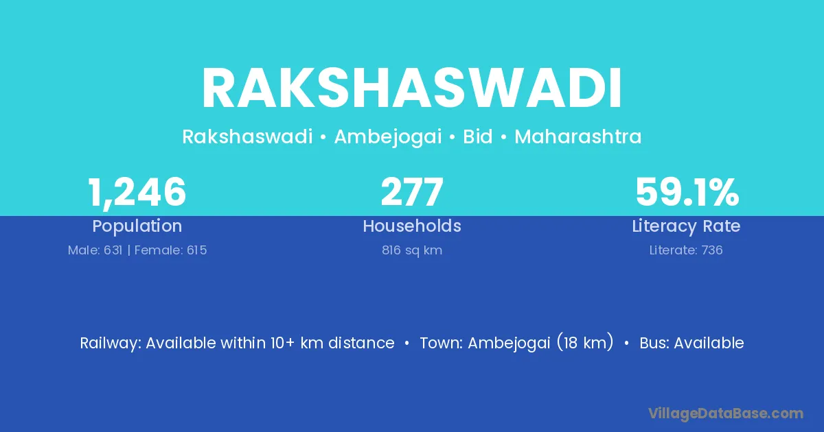 Ambejogai (18 km) is the nearest town to Rakshaswadi village for major economic activities and is located approximately 18 km away.