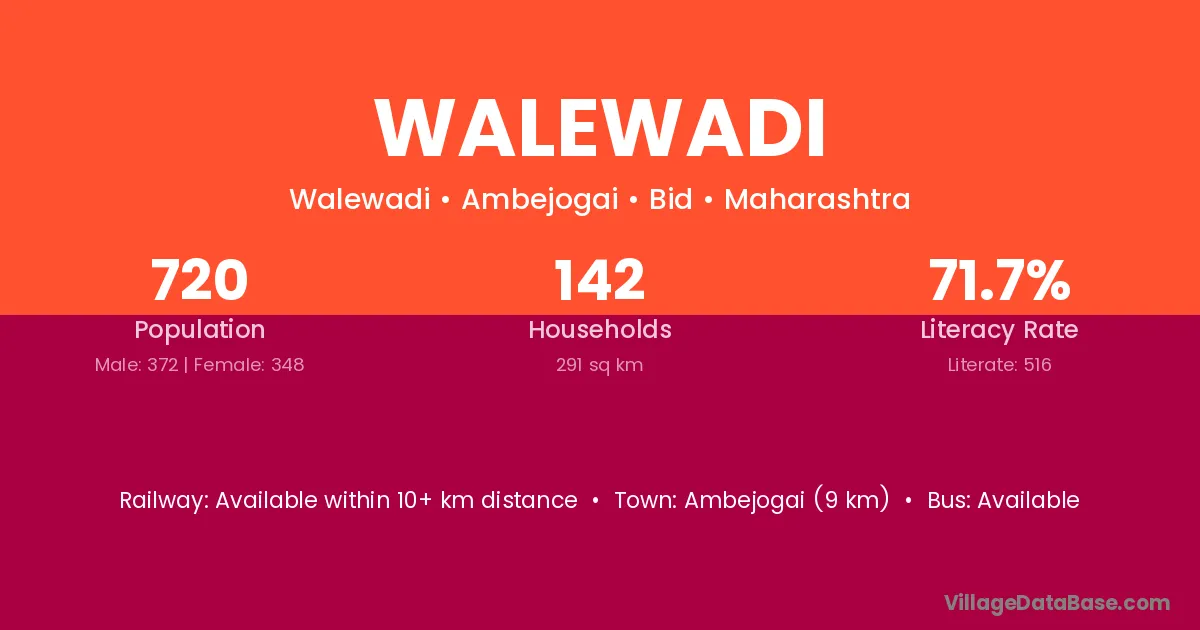 Walewadi village has a total population of 720 people, of which 372 are males and 348 are females.