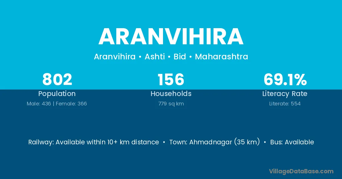 Ahmadnagar (35 km) is the nearest town to Aranvihira village for major economic activities and is located approximately 35 km away.