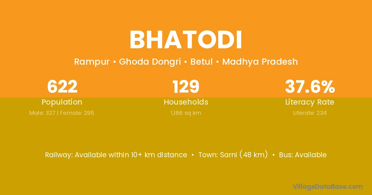 The literacy rate of Bhatodi village is 70.70%. Male literacy stands at 76.67% and female literacy at 64.05%.
