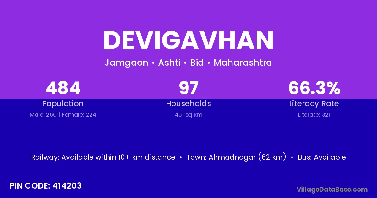 Devigavhan village has a total population of 484 people, of which 260 are males and 224 are females.