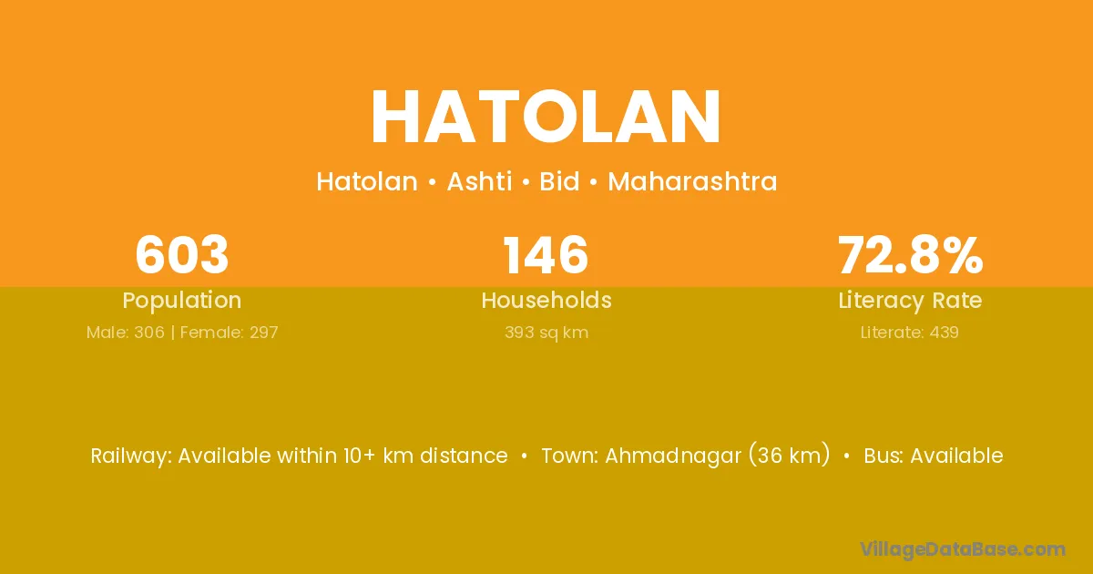 Ahmadnagar (36 km) is the nearest town to Hatolan village for major economic activities and is located approximately 36 km away.