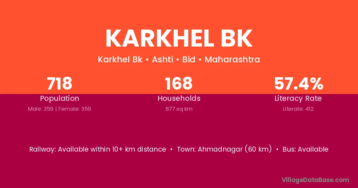 Ahmadnagar (60 km) is the nearest town to Karkhel Bk village for major economic activities and is located approximately 60 km away.