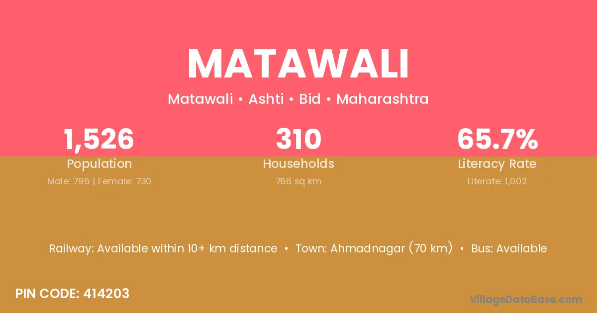 Ahmadnagar (70 km) is the nearest town to Matawali village for major economic activities and is located approximately 70 km away.