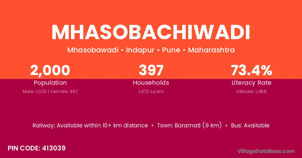 Mhasobachiwadi village has a total population of 909 people, of which 480 are males and 429 are females.