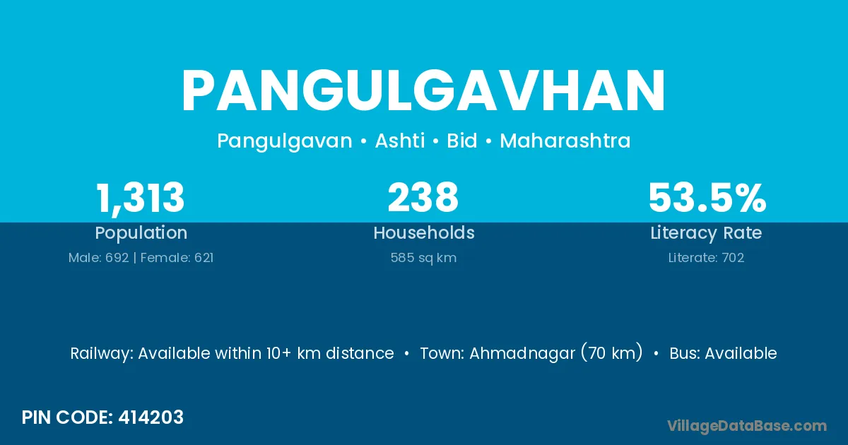 Ahmadnagar (70 km) is the nearest town to Pangulgavhan village for major economic activities and is located approximately 70 km away.