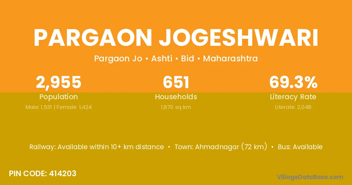 Ahmadnagar (72 km) is the nearest town to Pargaon Jogeshwari village for major economic activities and is located approximately 72 km away.