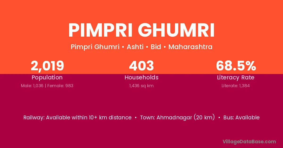 Ahmadnagar (20 km) is the nearest town to Pimpri Ghumri village for major economic activities and is located approximately 20 km away.