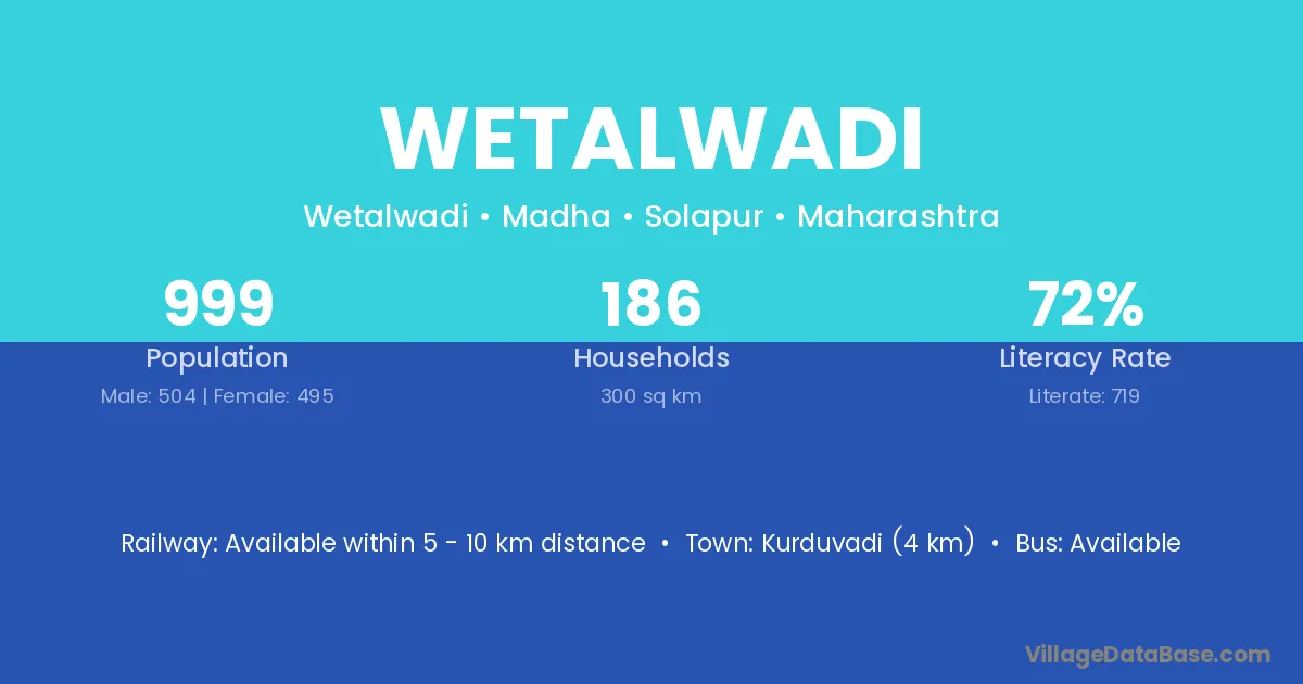Pathardi (39 km) is the nearest town to Wetalwadi village for major economic activities and is located approximately 39 km away.