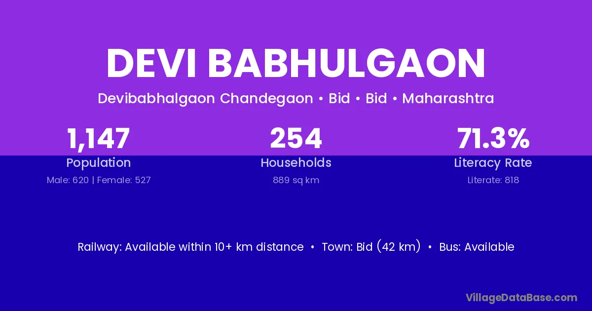 Bid (42 km) is the nearest town to Devi Babhulgaon village for major economic activities and is located approximately 42 km away.