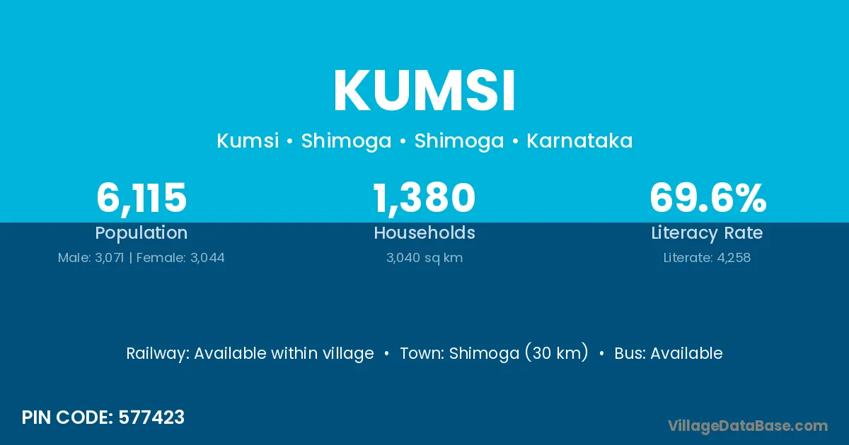 The literacy rate of Kumsi village is 61.38%. Male literacy stands at 67.97% and female literacy at 53.58%.