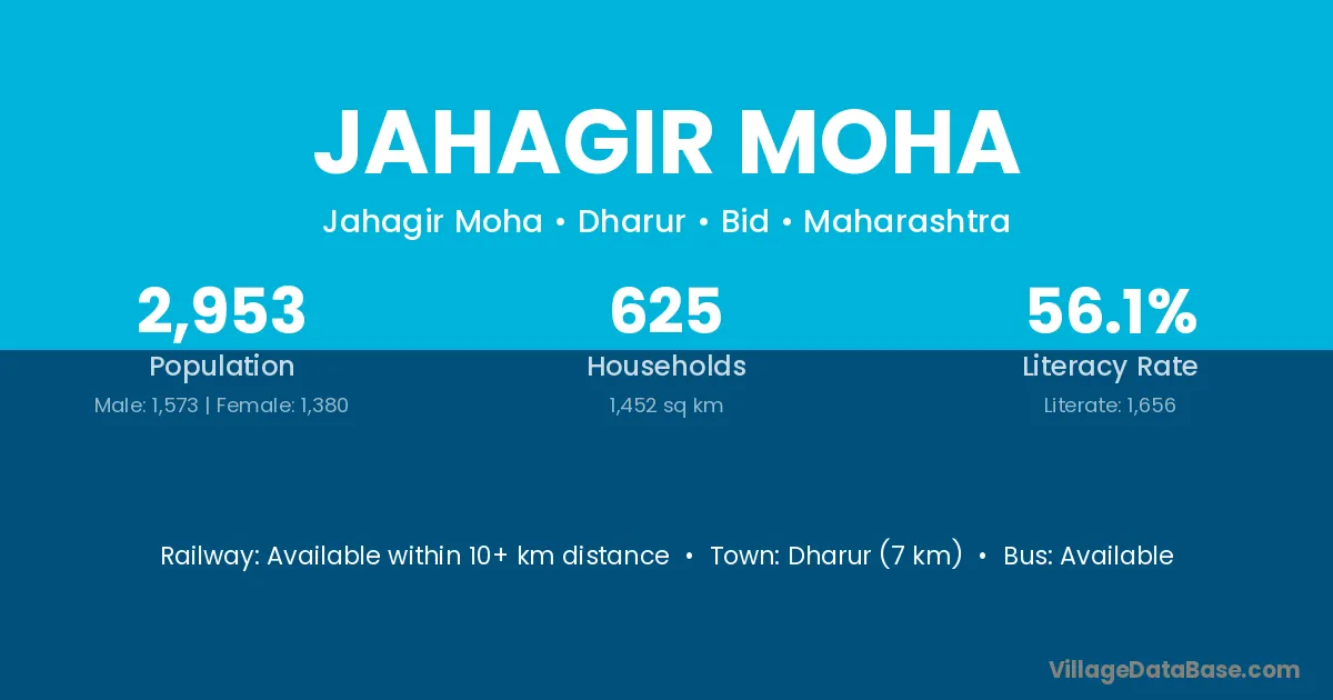 Dharur (7 km) is the nearest town to Jahagir Moha village for major economic activities and is located approximately 7 km away.