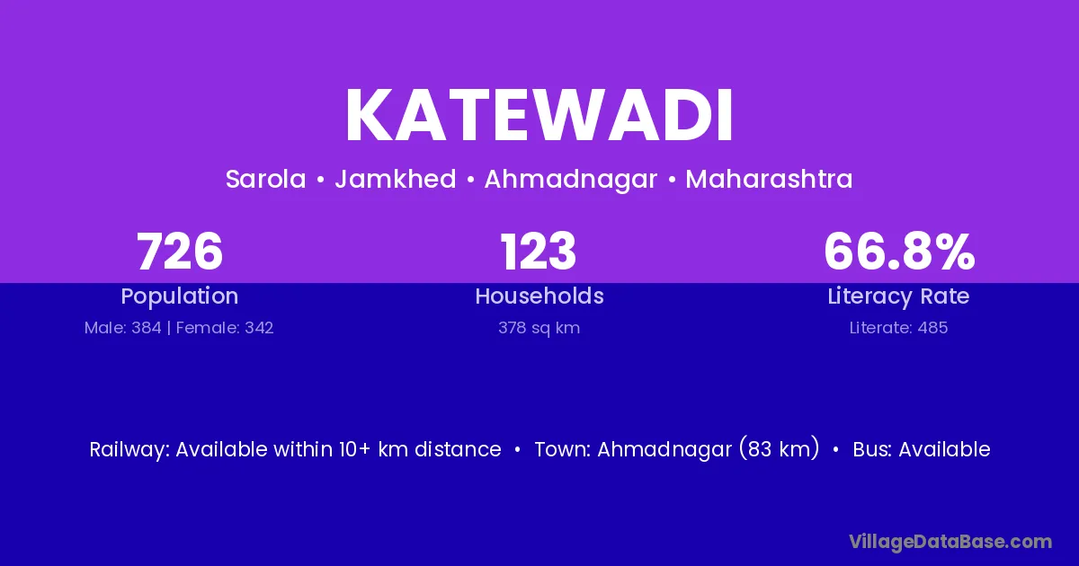 Dharur (22 km) is the nearest town to Katewadi village for major economic activities and is located approximately 22 km away.