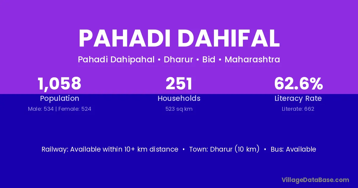 Dharur (10 km) is the nearest town to Pahadi Dahifal village for major economic activities and is located approximately 10 km away.