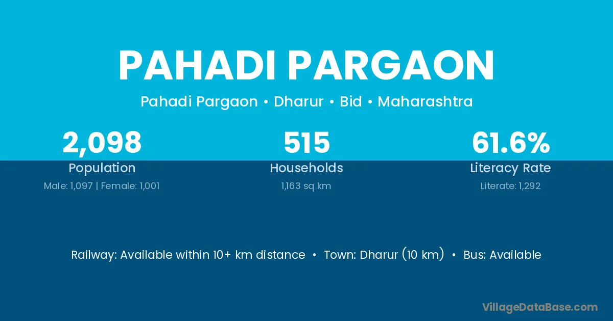 Dharur (10 km) is the nearest town to Pahadi Pargaon village for major economic activities and is located approximately 10 km away.