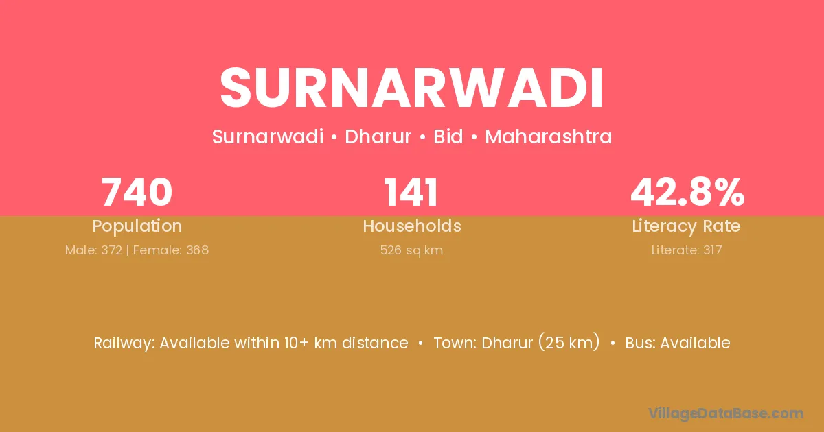 Surnarwadi village has a total population of 740 people, of which 372 are males and 368 are females.