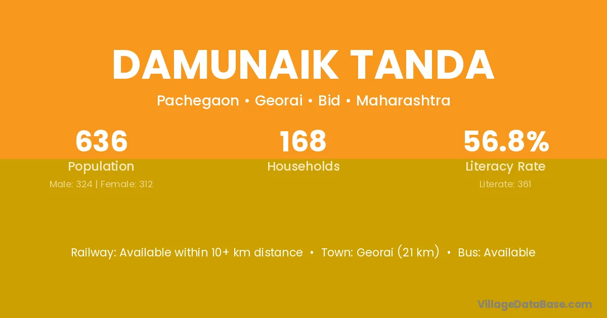 Georai (21 km) is the nearest town to Damunaik Tanda village for major economic activities and is located approximately 21 km away.