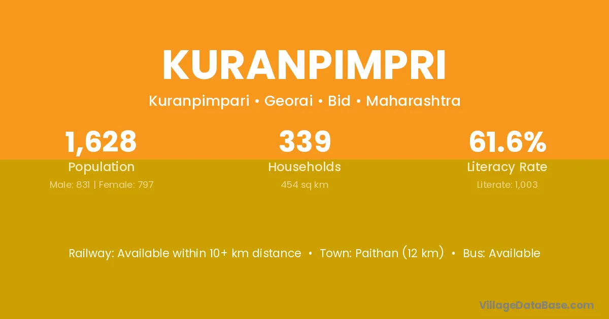 Paithan (12 km) is the nearest town to Kuranpimpri village for major economic activities and is located approximately 12 km away.