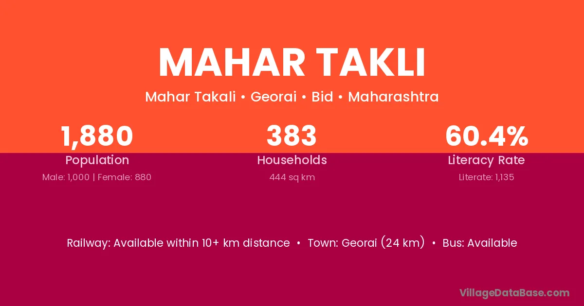 Georai (24 km) is the nearest town to Mahar Takli village for major economic activities and is located approximately 24 km away.