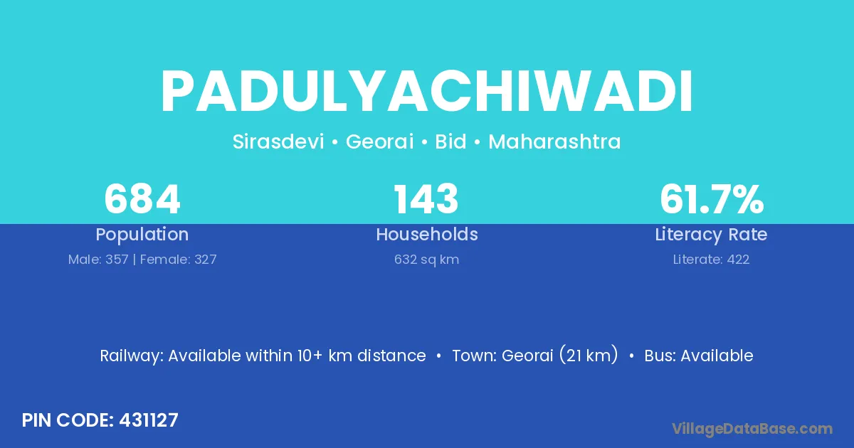 Georai (21 km) is the nearest town to Padulyachiwadi village for major economic activities and is located approximately 21 km away.