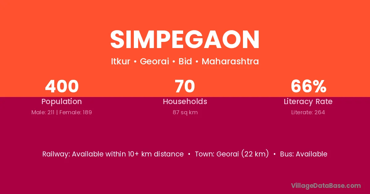 Georai (22 km) is the nearest town to Simpegaon village for major economic activities and is located approximately 22 km away.