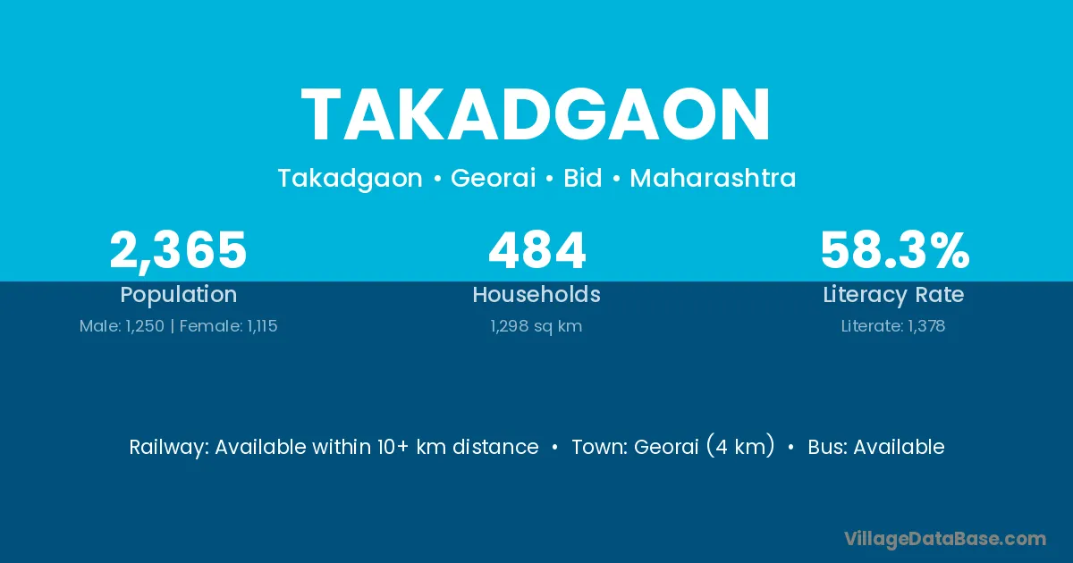 Georai (4 km) is the nearest town to Takadgaon village for major economic activities and is located approximately 4 km away.