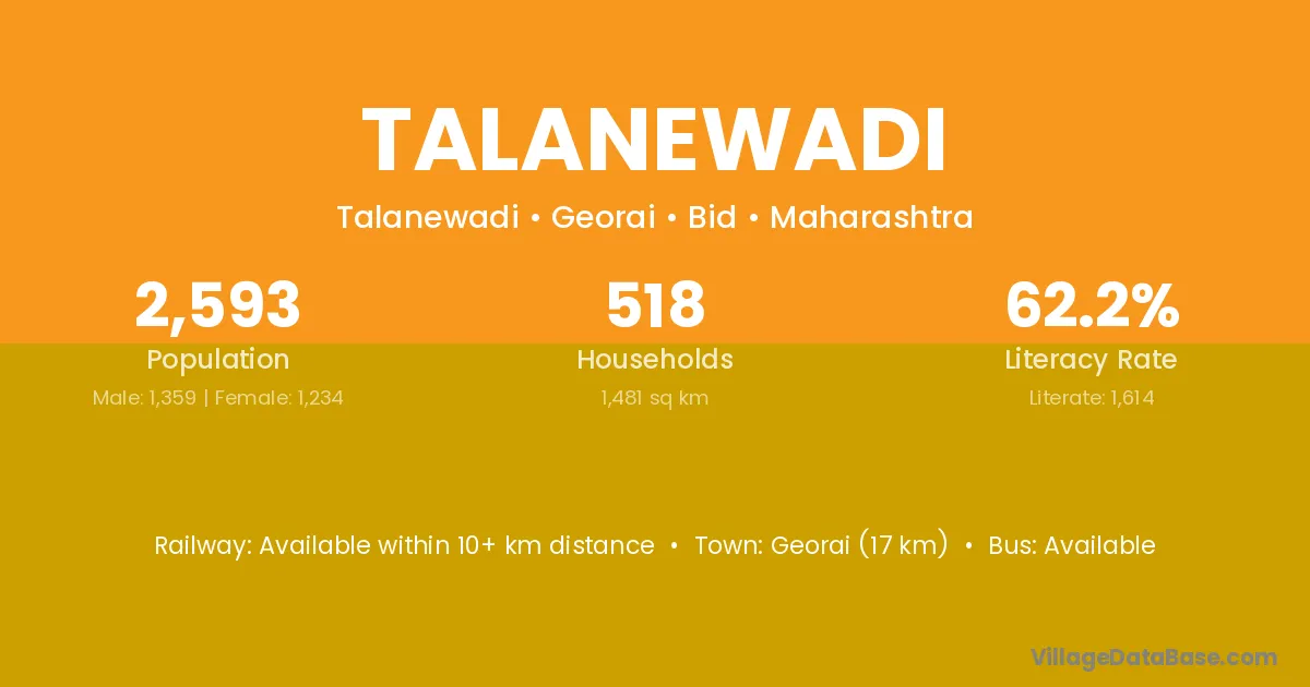 Georai (17 km) is the nearest town to Talanewadi village for major economic activities and is located approximately 17 km away.