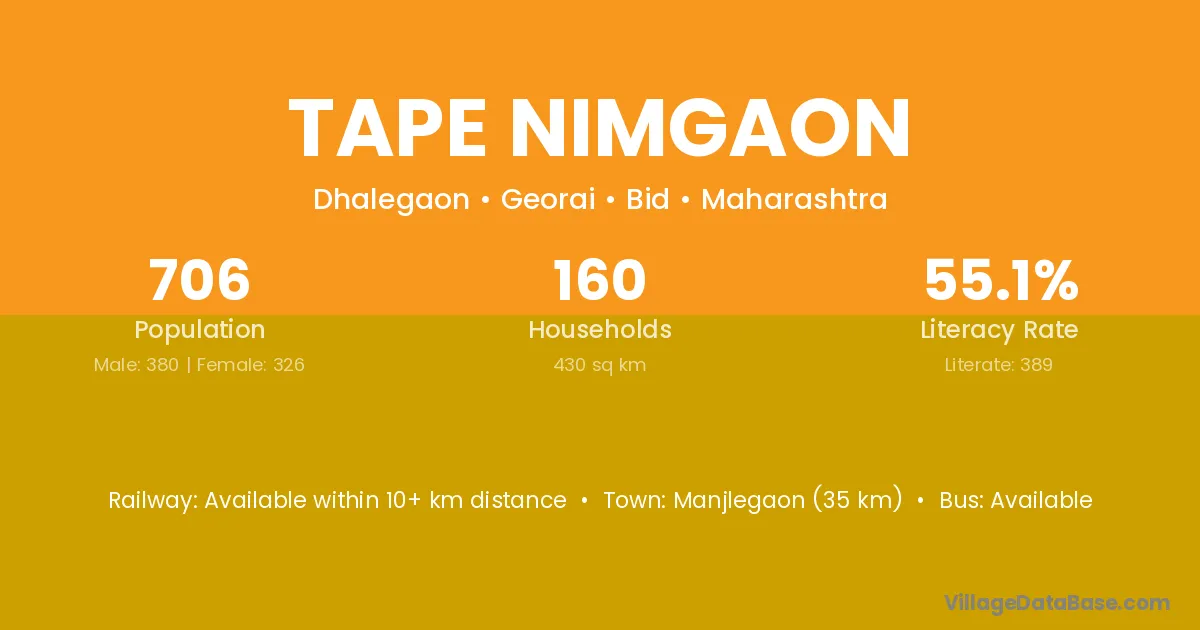 Manjlegaon (35 km) is the nearest town to Tape Nimgaon village for major economic activities and is located approximately 35 km away.