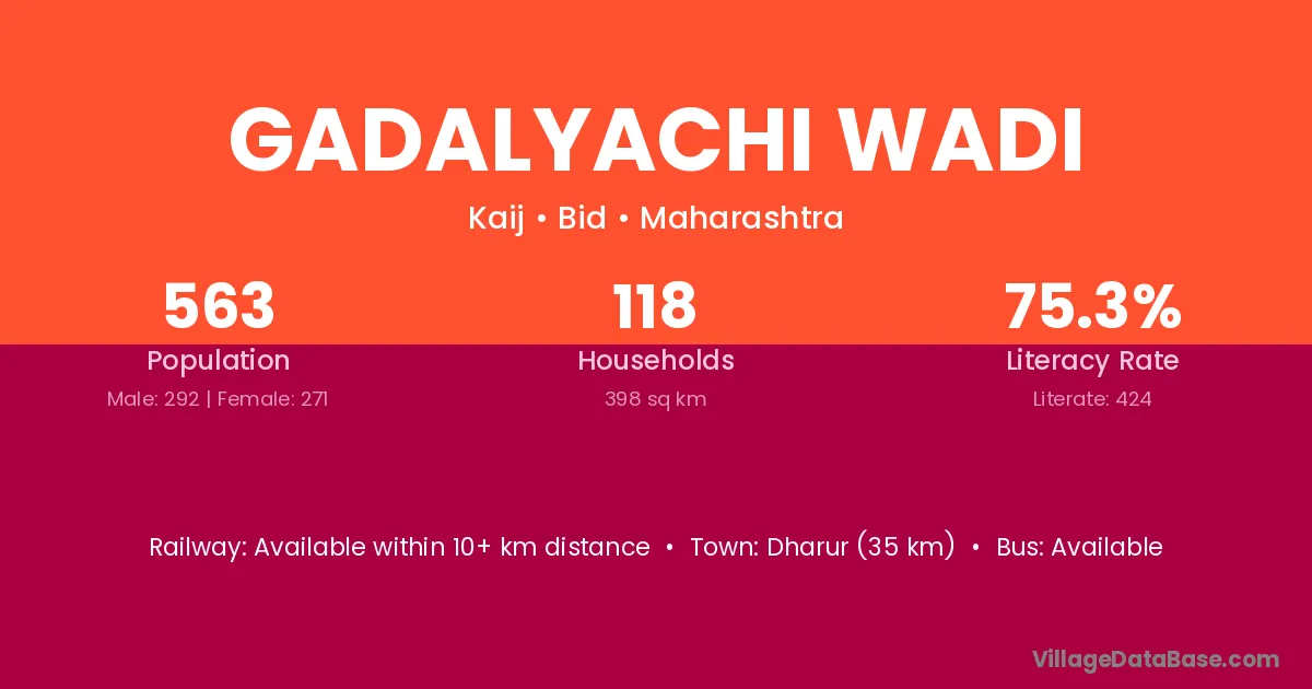 Dharur (35 km) is the nearest town to Gadalyachi Wadi village for major economic activities and is located approximately 35 km away.