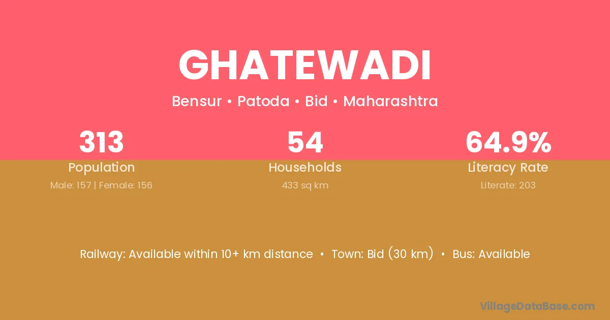 Bid (55 km) is the nearest town to Ghatewadi village for major economic activities and is located approximately 55 km away.