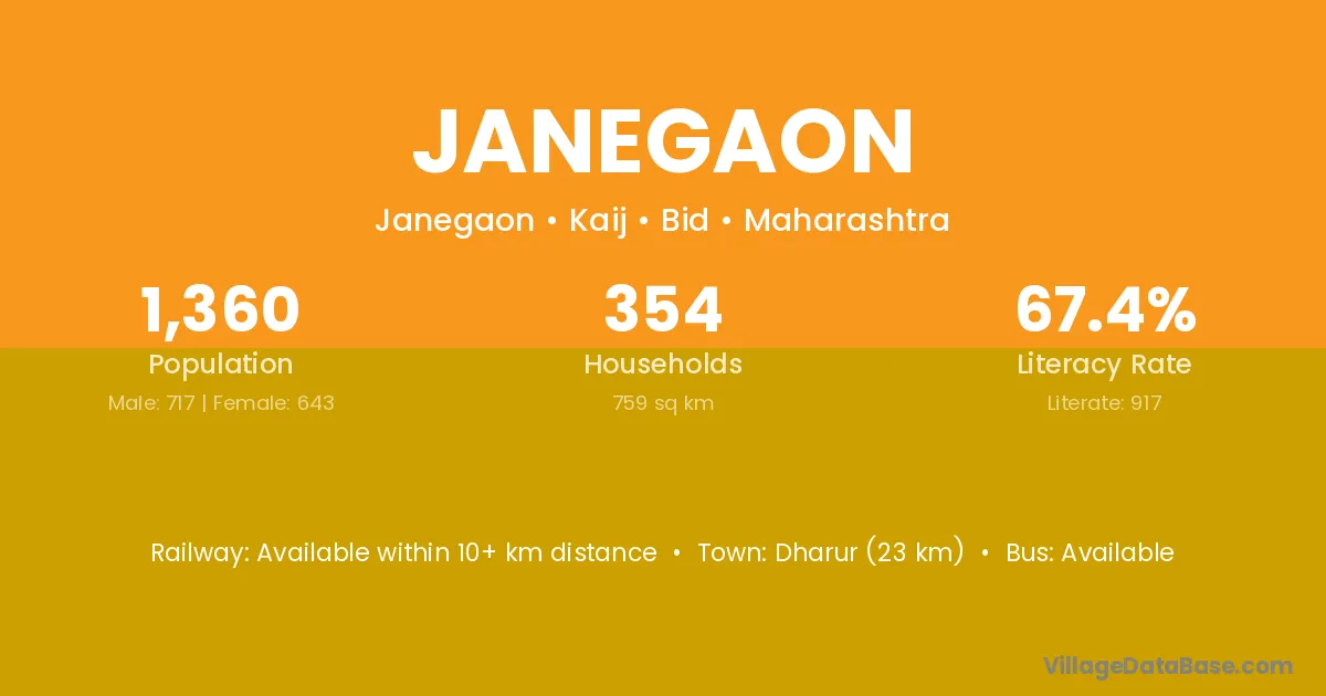 Dharur (23 km) is the nearest town to Janegaon village for major economic activities and is located approximately 23 km away.