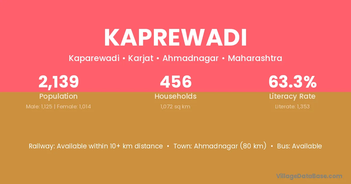 Kaij (22 km) is the nearest town to Kaprewadi village for major economic activities and is located approximately 22 km away.