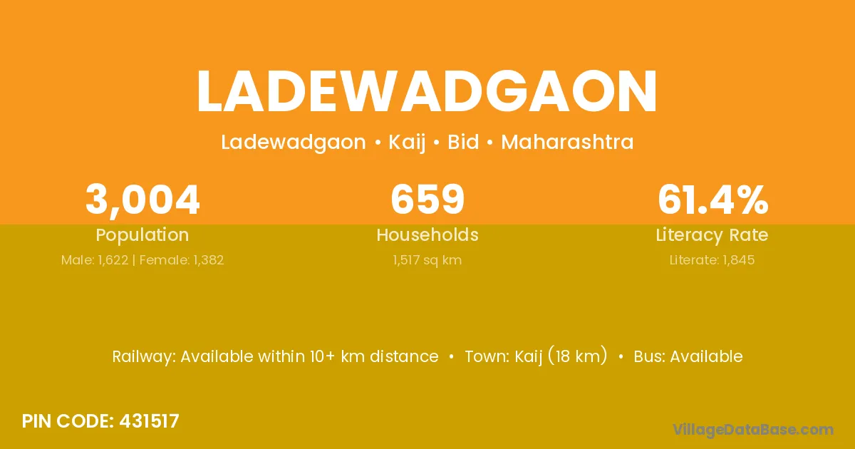 Kaij (18 km) is the nearest town to Ladewadgaon village for major economic activities and is located approximately 18 km away.