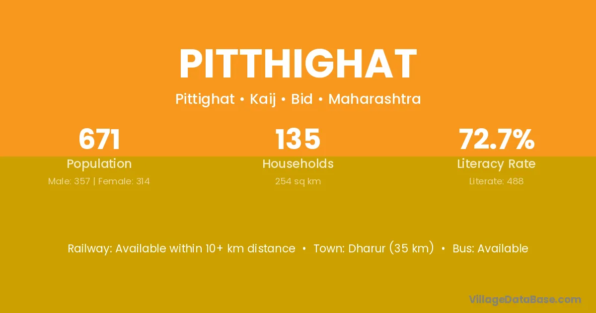 Dharur (35 km) is the nearest town to Pitthighat village for major economic activities and is located approximately 35 km away.