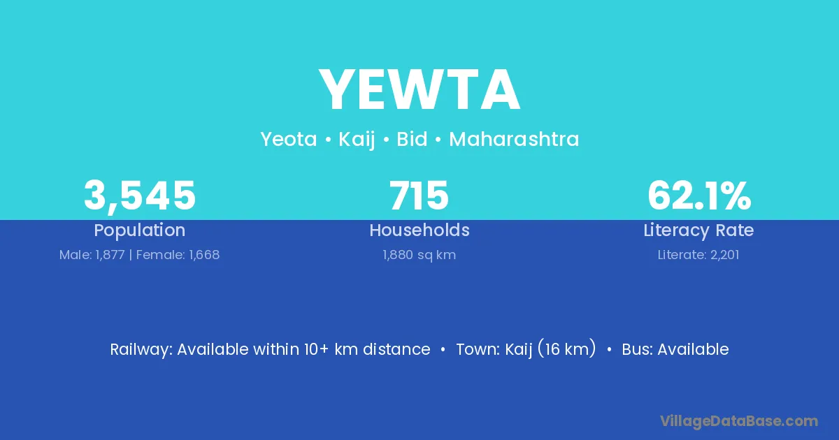 Yewta village has a total population of 3,545 people, of which 1,877 are males and 1,668 are females.
