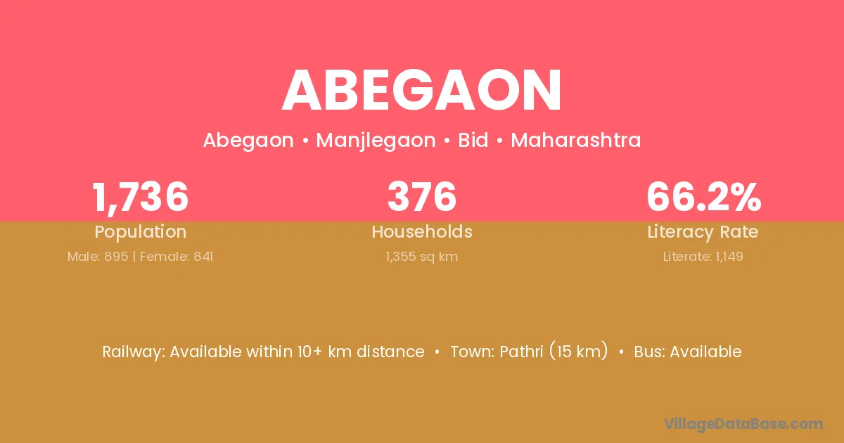 Abegaon village has a total population of 1,736 people, of which 895 are males and 841 are females.