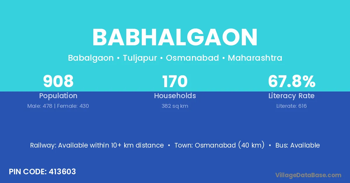 Babhalgaon village has a total population of 1,848 people, of which 980 are males and 868 are females.