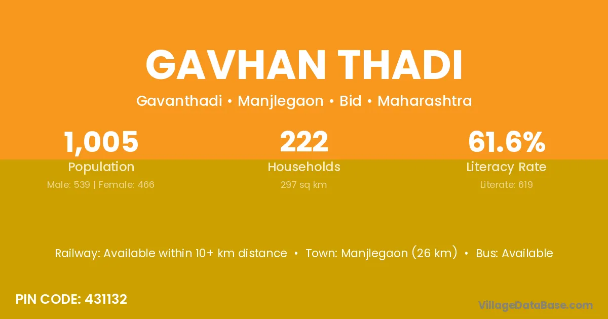 Manjlegaon (26 km) is the nearest town to Gavhan Thadi village for major economic activities and is located approximately 26 km away.