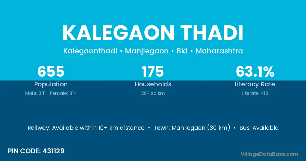 Manjlegaon (30 km) is the nearest town to Kalegaon Thadi village for major economic activities and is located approximately 30 km away.